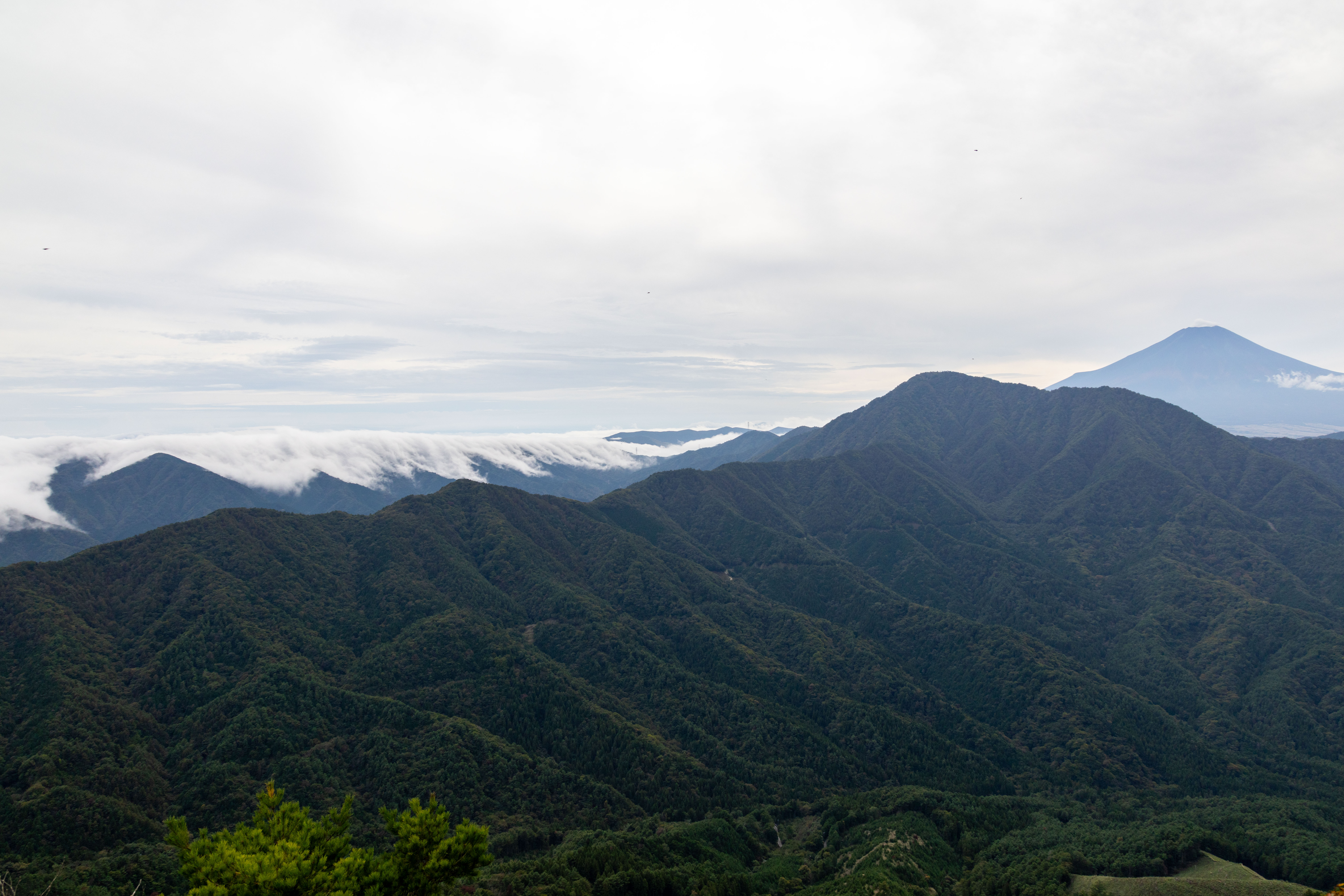 富士山の周辺は雲に覆われていますが、山があるところでは尾根から滝雲が流れていました。