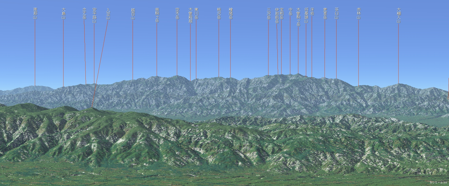 奥の右側の真っ白な山が木曽駒ケ岳、その左側に中岳、宝剣岳、伊那前岳、三沢岳と続き、檜尾岳、熊沢だけ、東川岳、空木岳、南駒ケ岳。