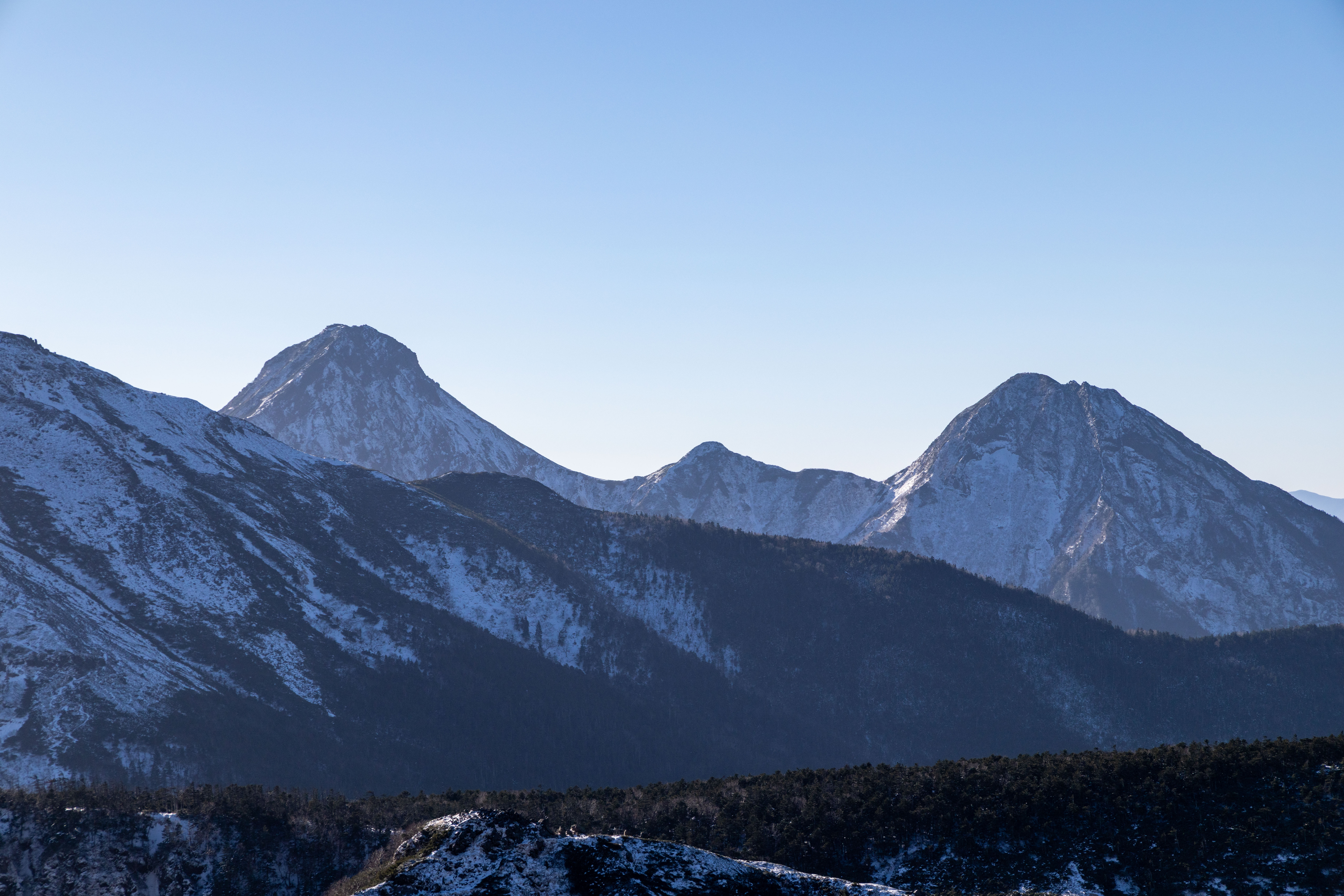 左側が木曽御嶽山、真ん中が摩利支天山、右側が継子岳。
