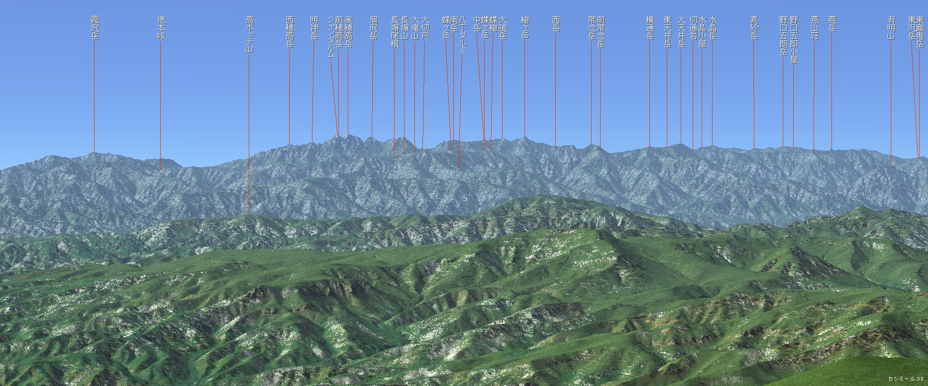 左側が霞沢岳、少し間をあけて穂高連峰(西穂高岳、明神岳、前穂高岳、奥穂高岳)、涸沢岳、大キレットを挟んで南岳(その手前が蝶ヶ岳)、大喰岳、槍ヶ岳、西岳、常念岳、横通岳、東天井岳、大天井岳、その奥には水晶岳、真砂岳辺りまで見えています。